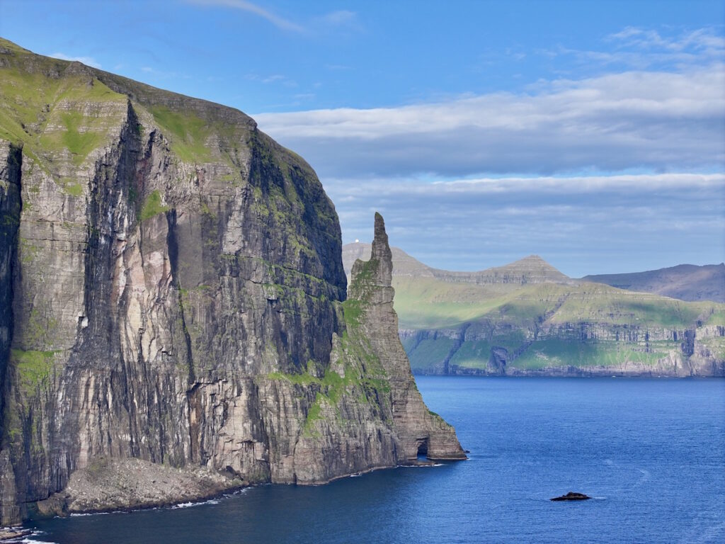 To jedno z najbardziej znanych miejsc Wysp Owczych. Klif Trælanípa opada pionowo do oceanu, a z jego szczytu widać fenomen optyczny – jezioro Sørvágsvatn wygląda tak, jakby unosiło się wysoko ponad poziomem morza. Na końcu trekkingu docieramy też do wodospadu Bøsdalafossur, gdzie słodkowodne jezioro spada bezpośrednio do Atlantyku. Absolutny must-see!